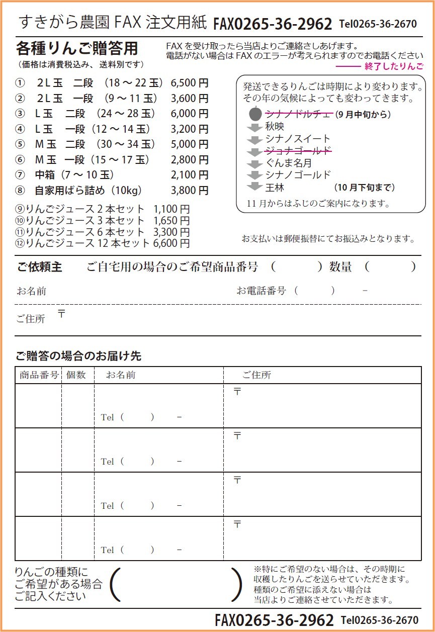 TEL 0265-36-2670 (電話対応可能時間:10時~17時) FAX 0265-36-2962 (FAXでのご注文は24時間受付可能です) |